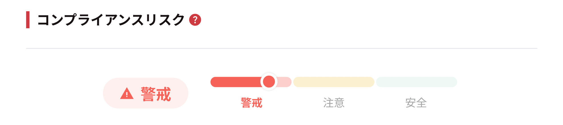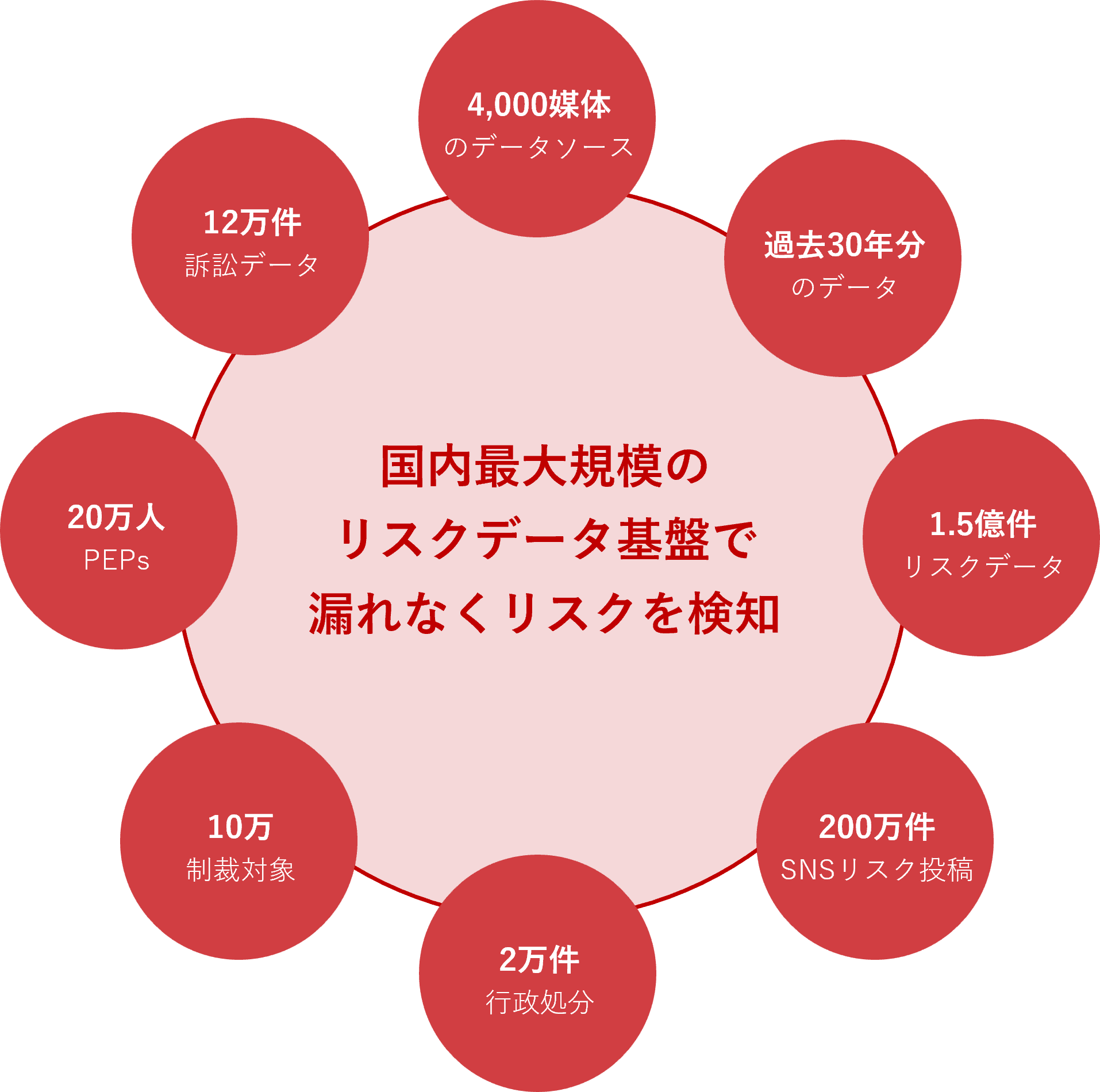 企業が抱えるコンプライアンスリスクは、法的リスクから、労務リスク、ビジネスリスクまで多岐にわたります。これらを見落とすと信用低下や業務停止など深刻な被害を招くおそれも。Riskdogは国内最大級のリスクデータ基盤を活用し、こうした潜在リスクを幅広く検知・分析して、重大なリスクの早期発見と予防をサポートします。