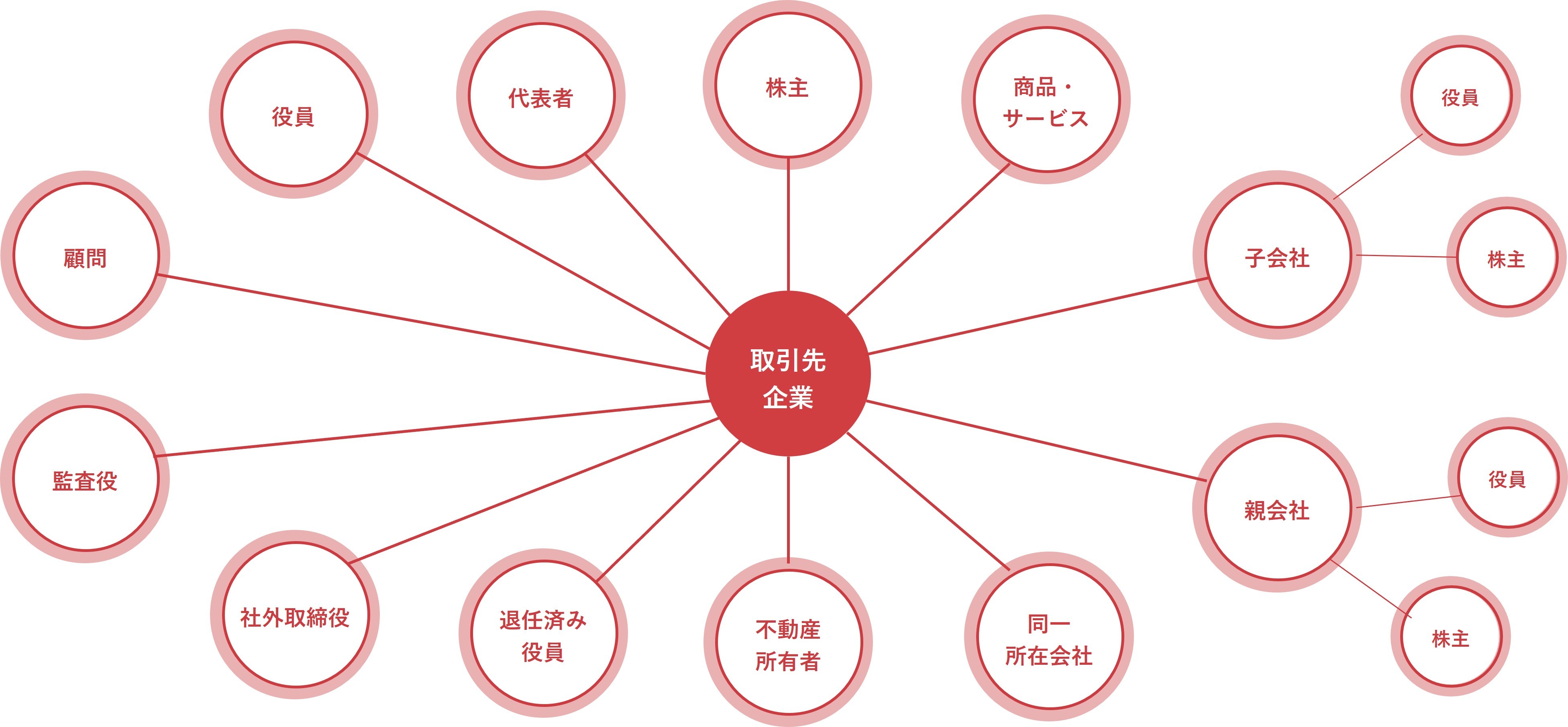 従来のチェックでは把握しにくい潜在的なリスクや相手企業の関係性を明確化し、真に価値あるコンプライアンスチェックを実現します。