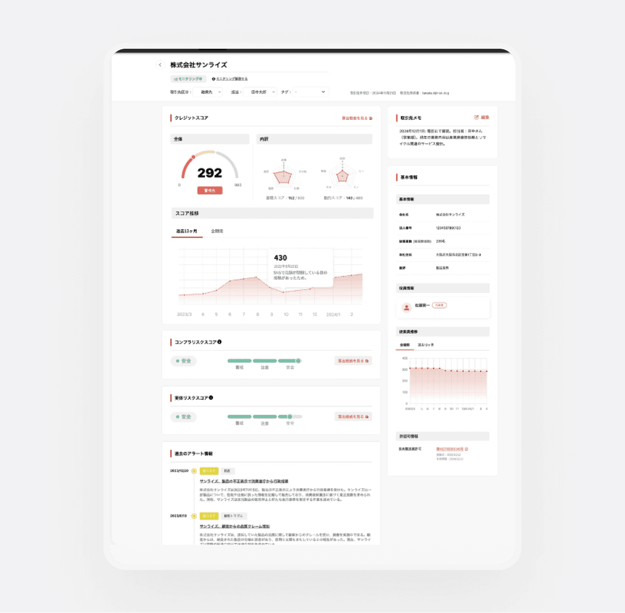 AIによる企業リスクスコアと、ニュース・行政処分・評判情報の横断収集。